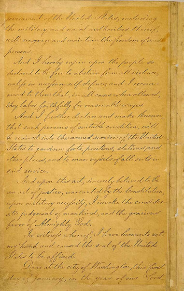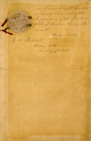 The original of the Emancipation Proclamation of January 1, 1863, is in the National Archives in Washington, DC. With the text covering five pages the document was originally tied with narrow red and blue ribbons, which were attached to the signature page by a wafered impression of the seal of the United States. Most of the ribbon remains; parts of the seal are still decipherable, but other parts have worn off.