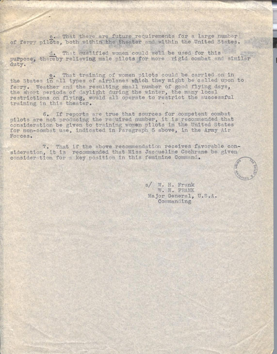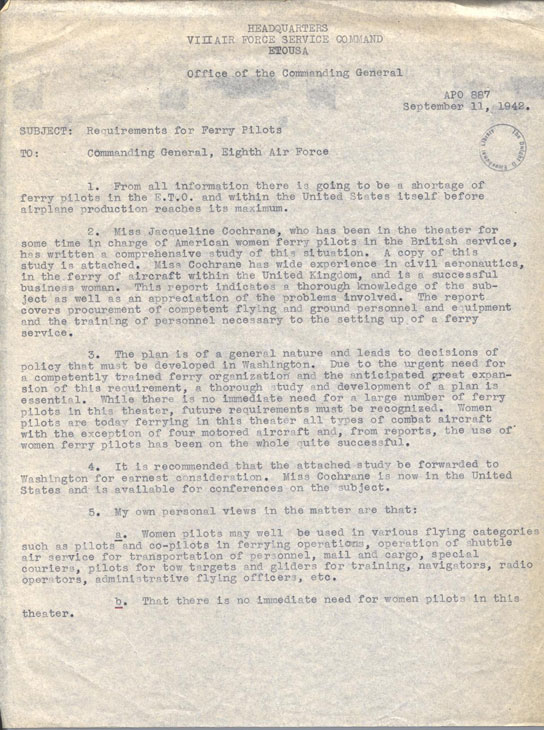 This Memorandum to the Commanding General of the Air Force included Jackie Cochran’s proposal for training women pilots.