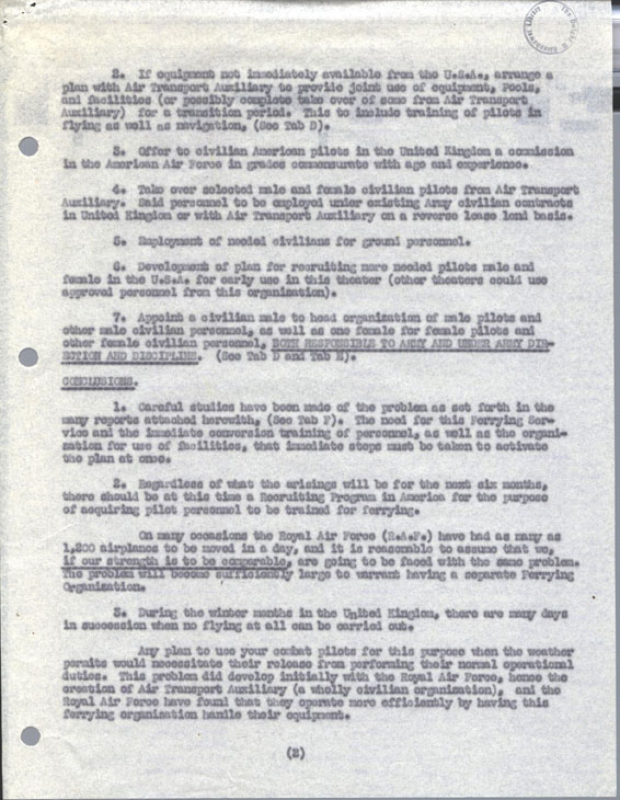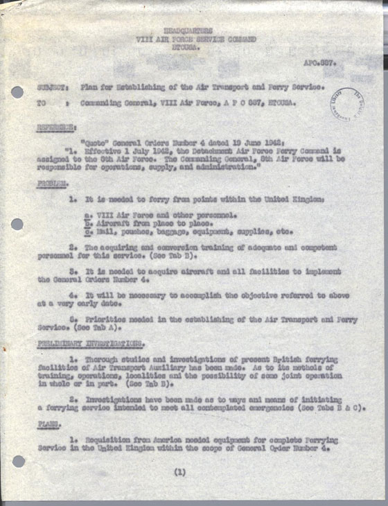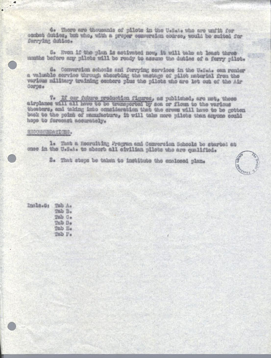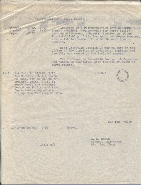 Jackie Cochran's Proposed Plan for Training of Women Ferrying Pilots Reviewed by U.S. Army Air Force