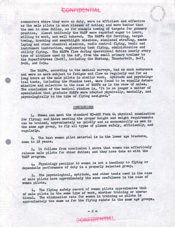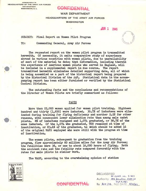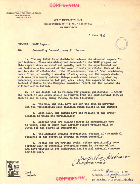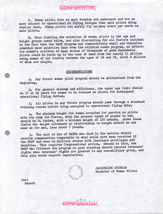 Jackie Cochran's Final Report on WASP to Commanding General,